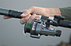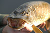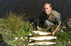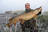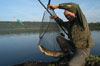 Pêche au brochet en Normandie. Des pêcheurs sur les bords d'un étang. Moulinet , bouchon , épuisette , barque , prises de pêche , tête de brochet